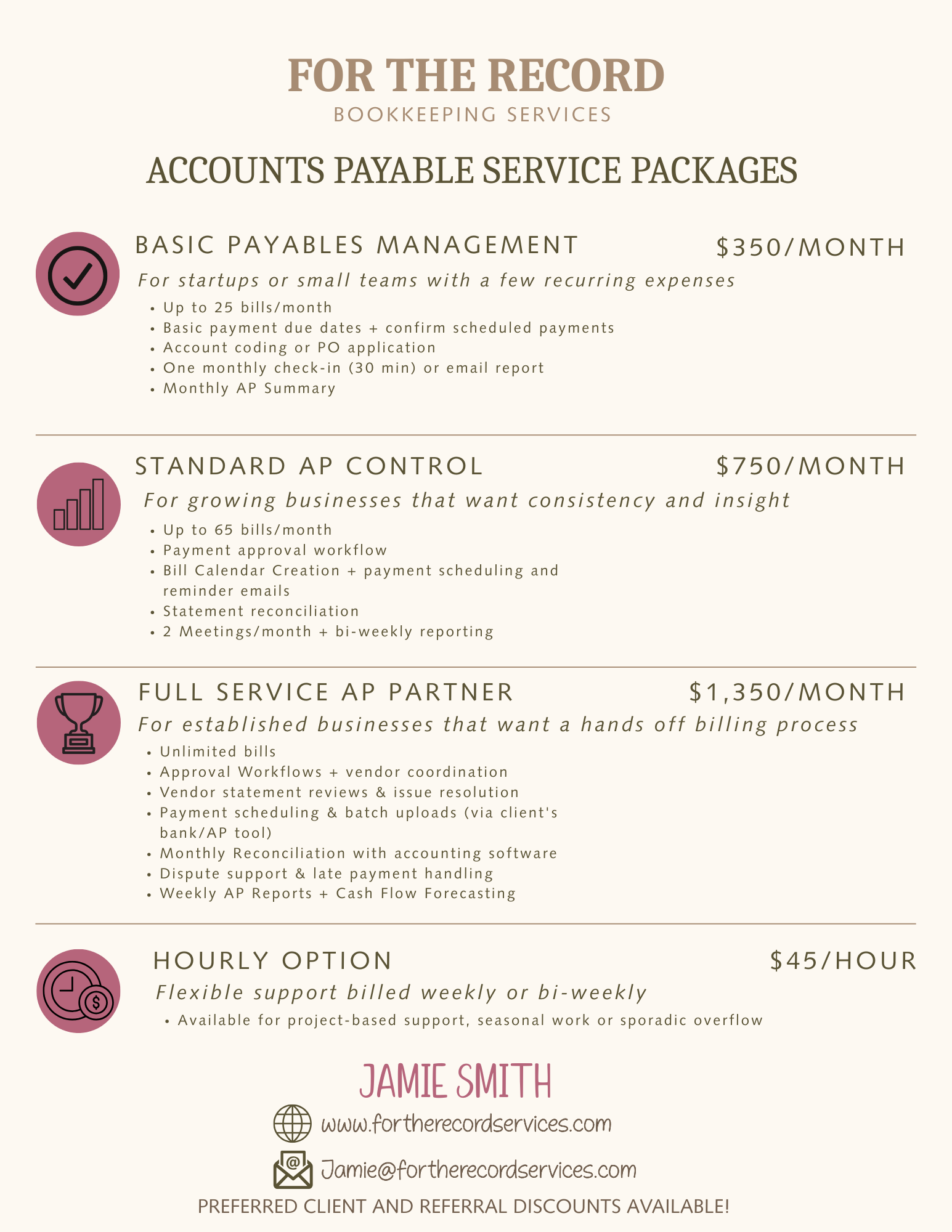 A comprehensive financial management solution designed for growing businesses that crave efficiency and peace of mind. This all-in-one package handles your billing, accounts payable, and full-cycle bookkeeping—giving you accurate records, timely payments, and streamlined operations, all under one trusted partner.
